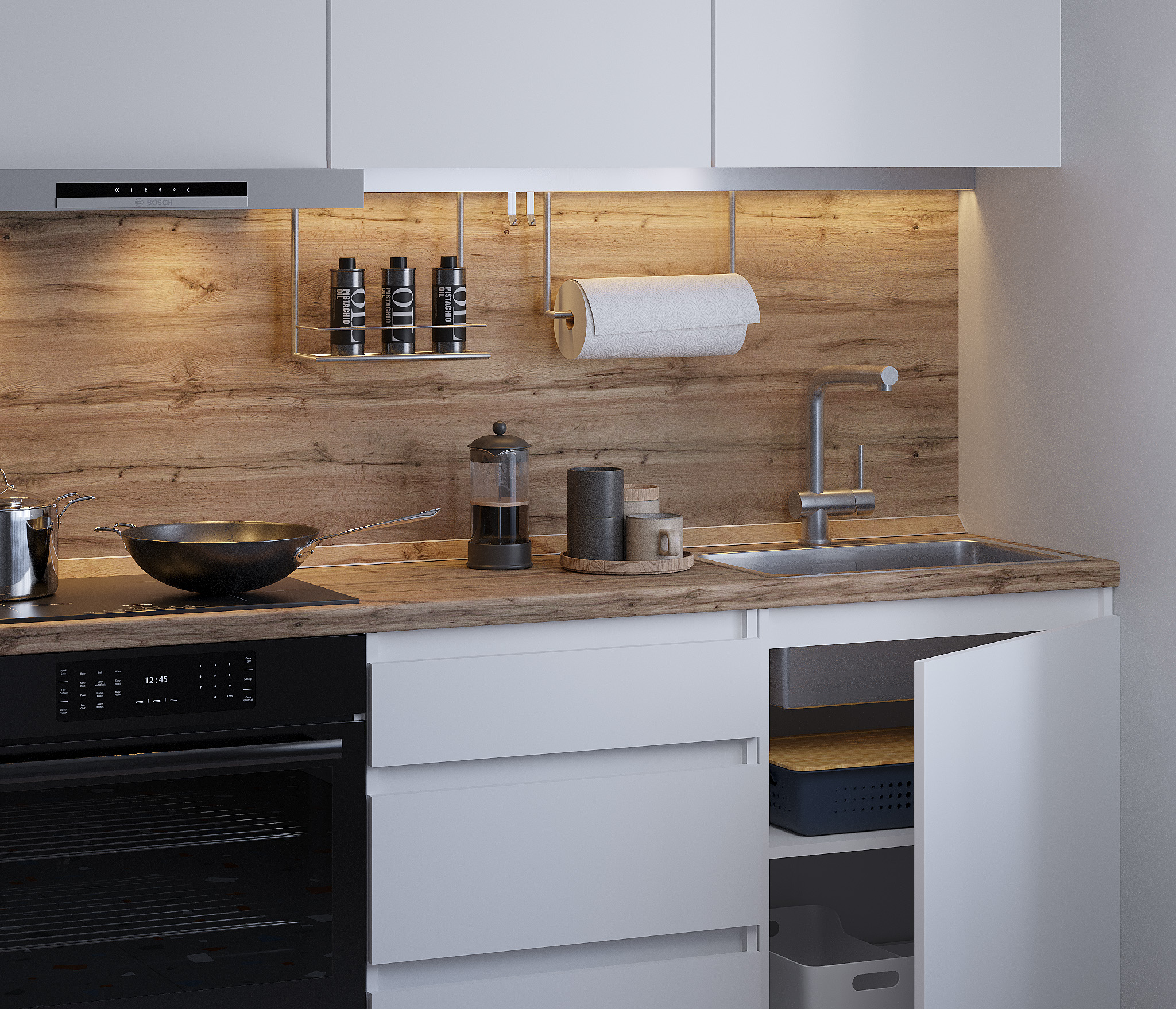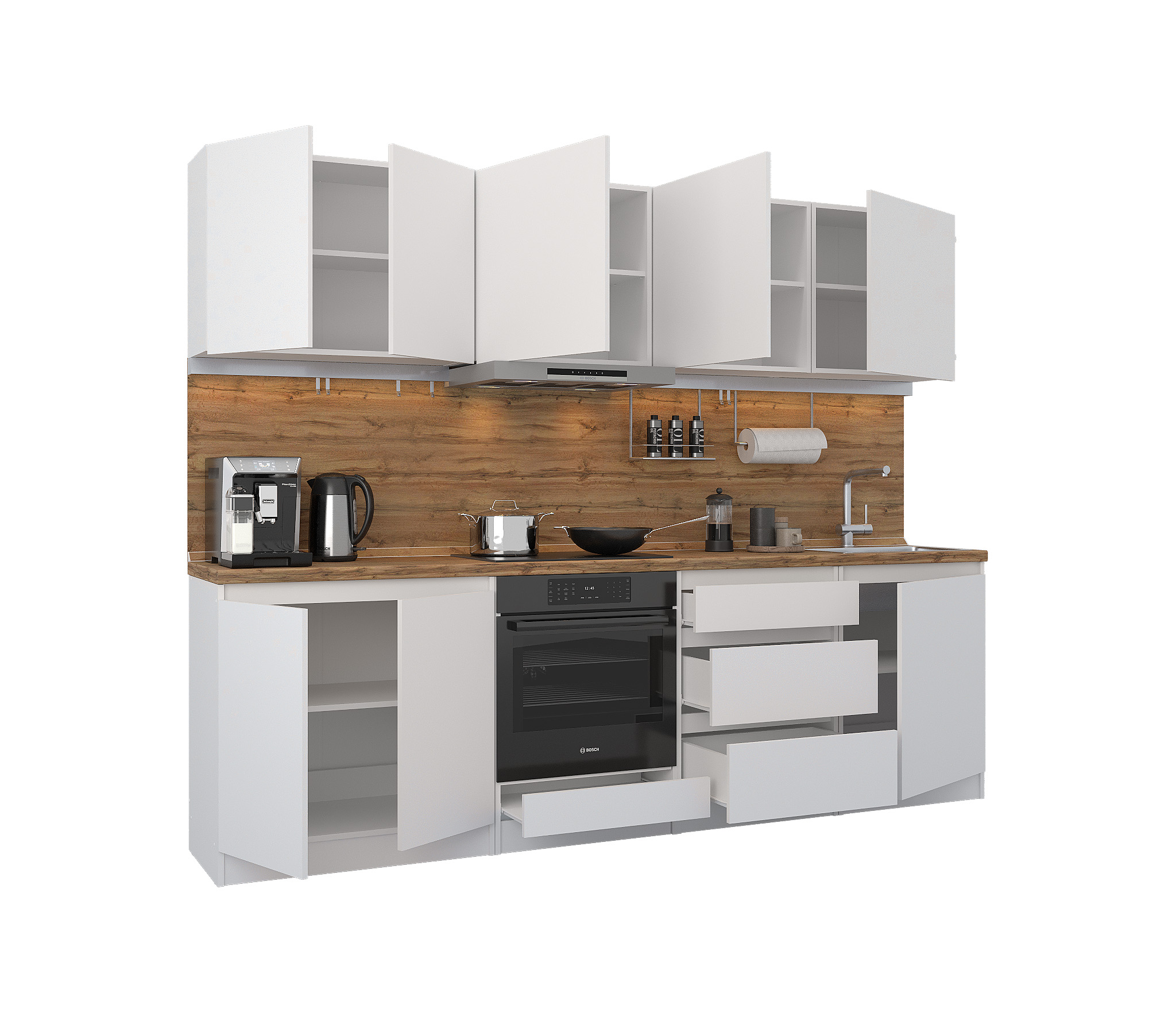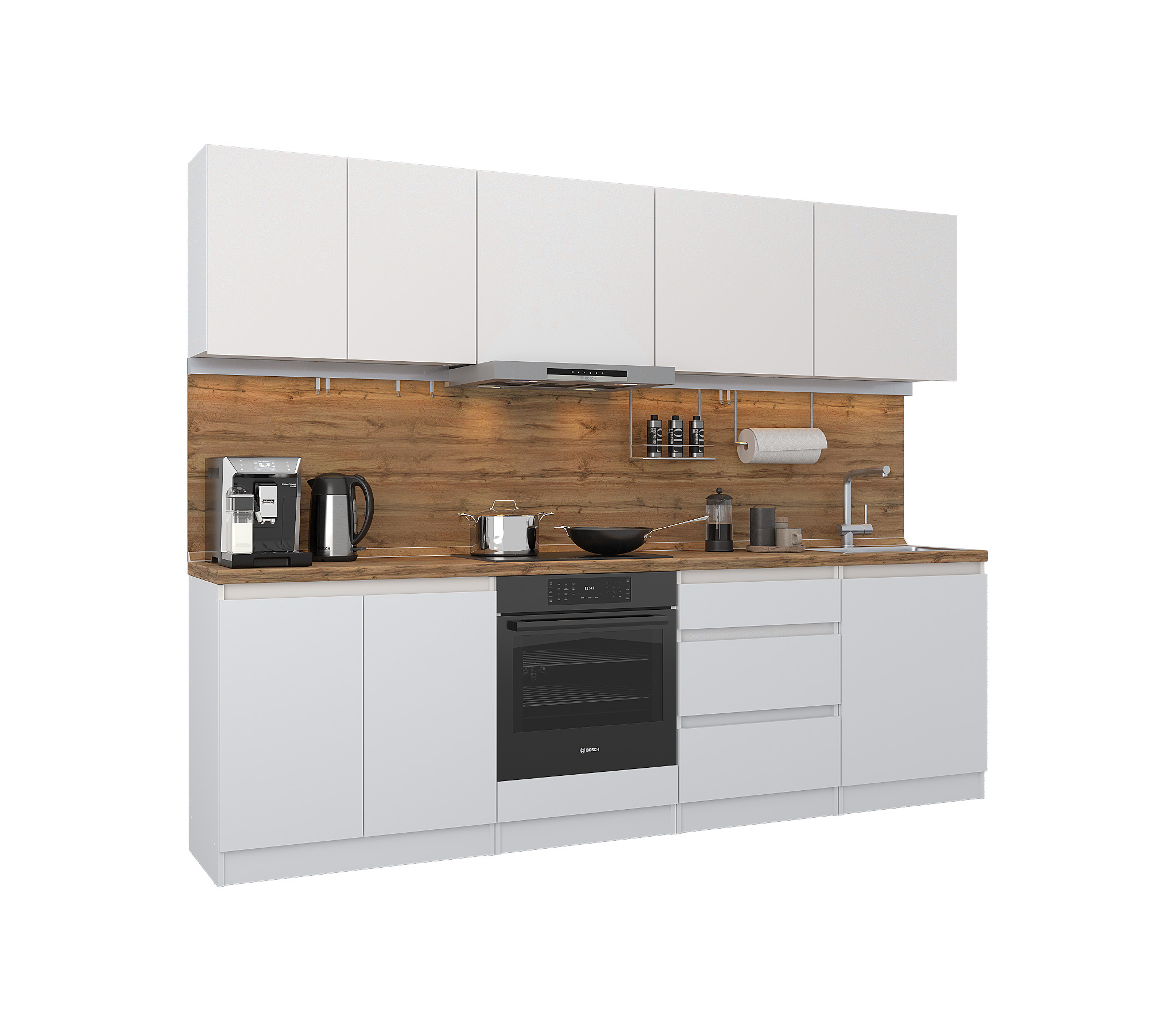 Кухня Леон сочетает в себе функциональность, стиль и доступность, и является прекрасным выбором для тех, кто ищет компактное и удобное решение для своей кухни. Кухонный гарнитур Леон идеально подходит для помещений с ограниченным пространством. Корпус и фасады выполнены из белого ЛДСП. Фасады столов и шкафов не имеют лицевой фурнитуры и открываются захватом за тыльный край фасада. Леон смотрится современно, а отсутствие ручек упрощает уход за поверхностью.