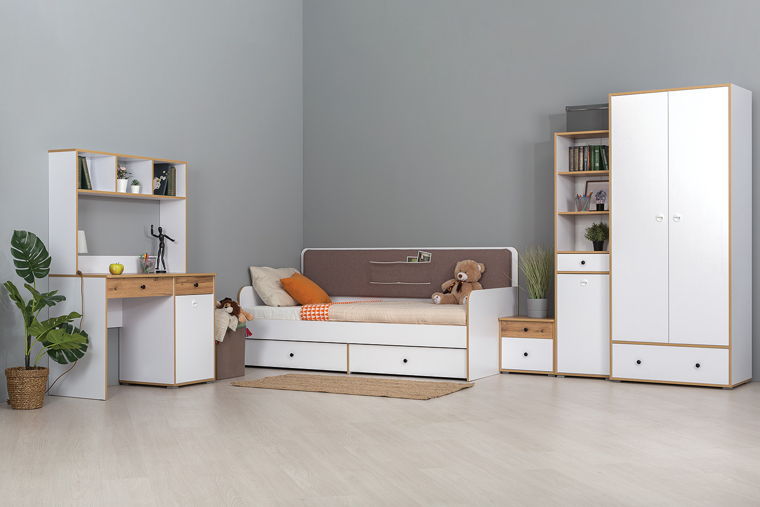 Комбинация закрытых и открытых полок позволит содержать в порядке книги, игрушки или различные материалы для творчества.
