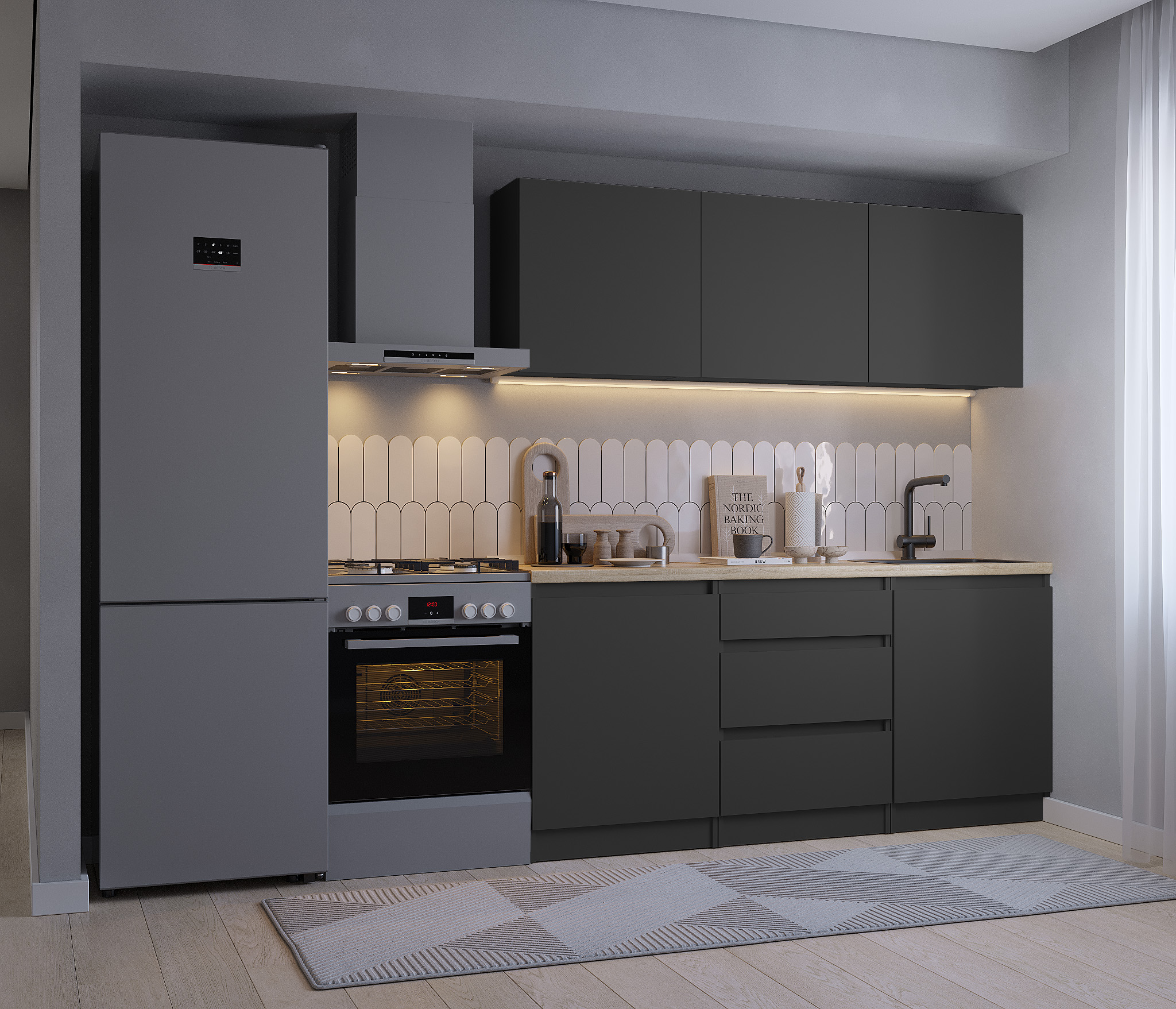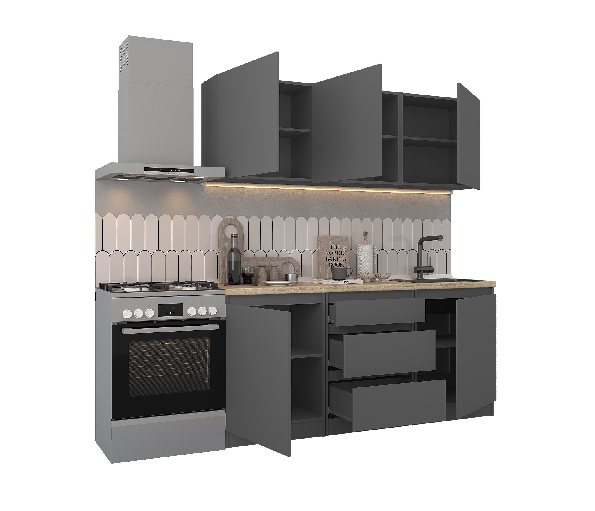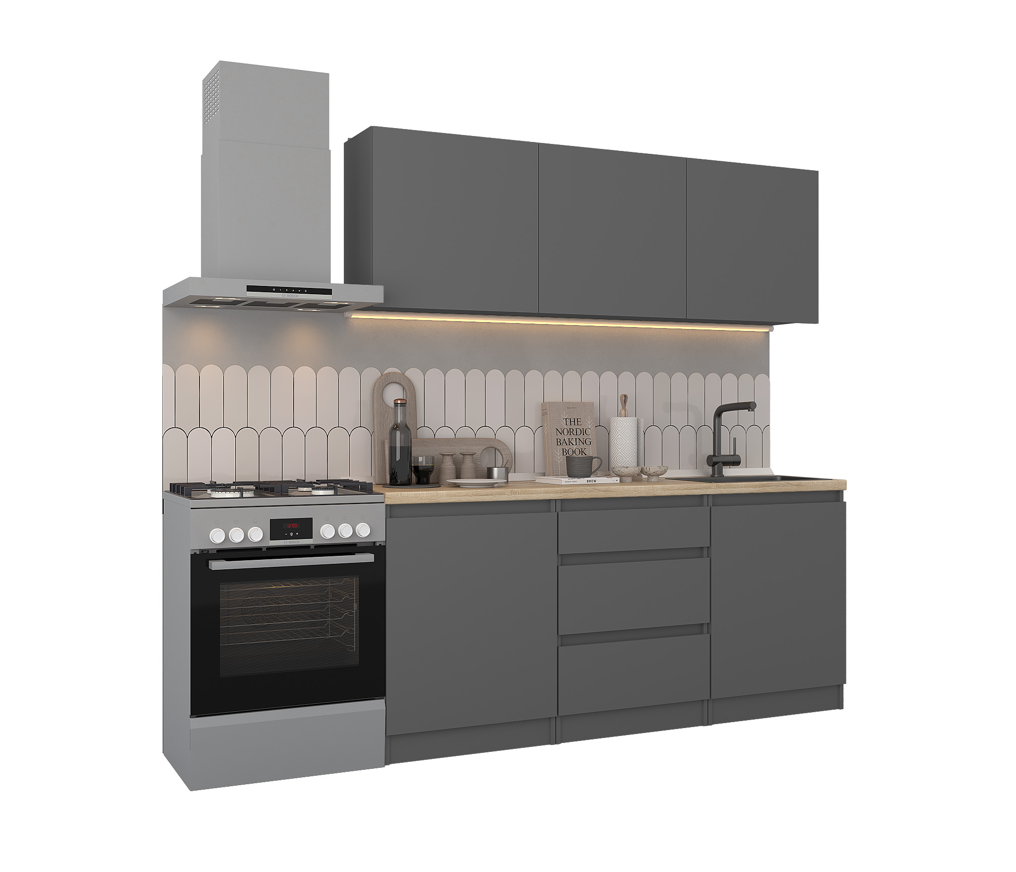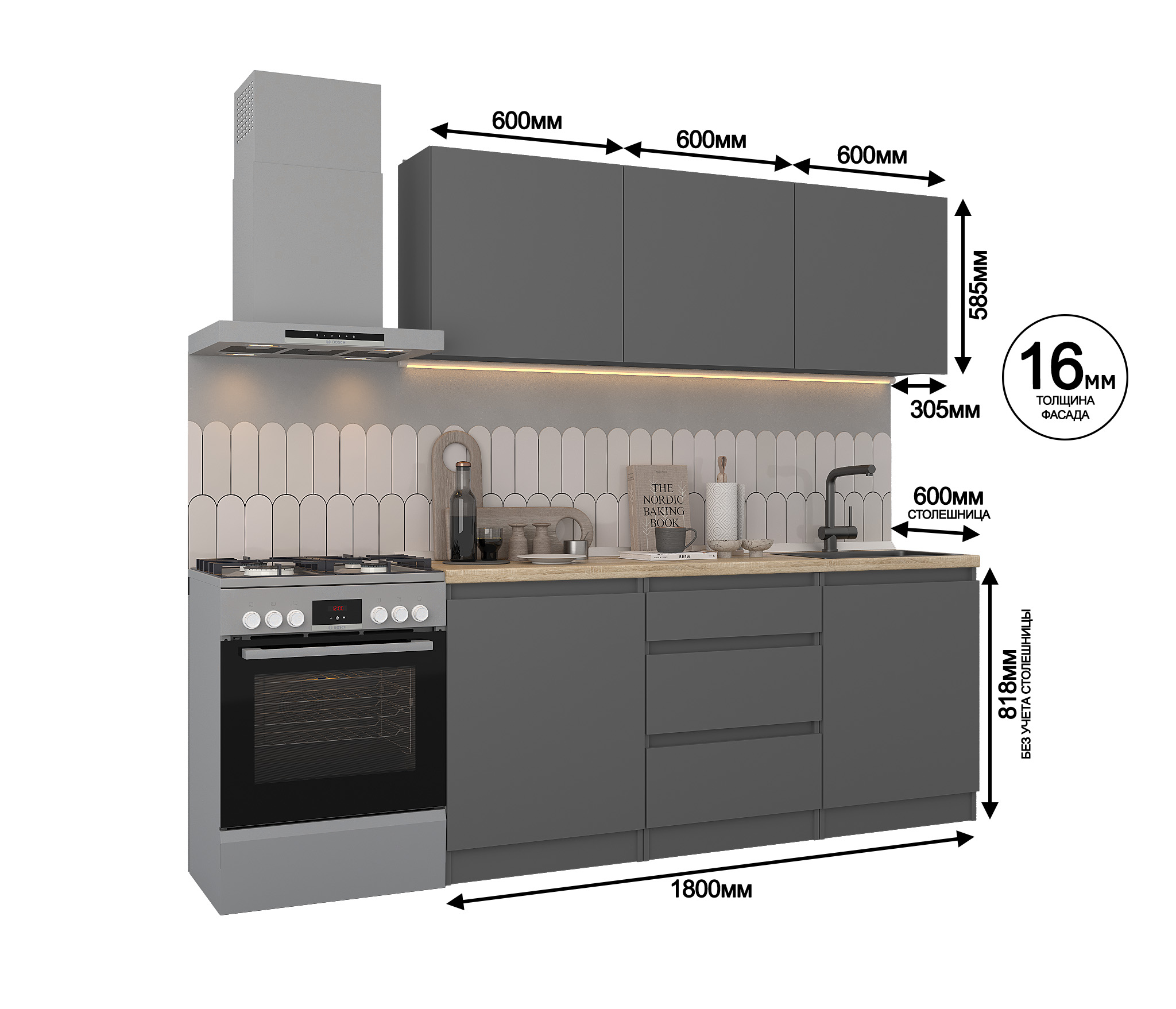 Обратите внимание, что столешница, стеновая панель, мойка и смеситель не входят в комплектацию кухни Леон и приобретаются отдельно. Это позволяет вам выбрать идеальные аксессуары и элементы для создания индивидуального дизайна вашей кухни.