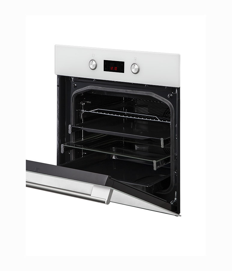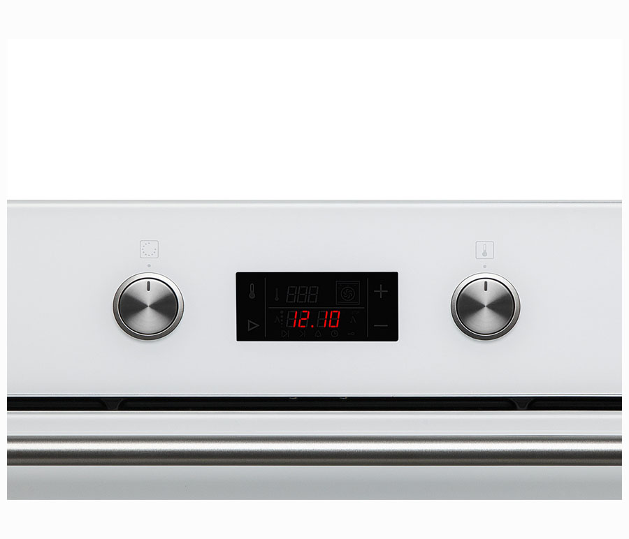 Духовой шкаф с сенсорным электронным управлением TouchControl, LED дисплей, температурный щуп FoodProbe, панель управления - нерж+черное стекло, 9 режимов нагрева, объем духовки 65 л, телескопические направляющие на трех уровнях, утапливаемые переключатели, трехслойное остекление, каталитическая самоочистка, спец.функция очистки Steam cleaning, автоматическое отключение, в комплекте: глубокий противень, противень для выпечки и хромированная решетка, стеклянный противень, ручка для извлечения противней, цвет: белое стекло