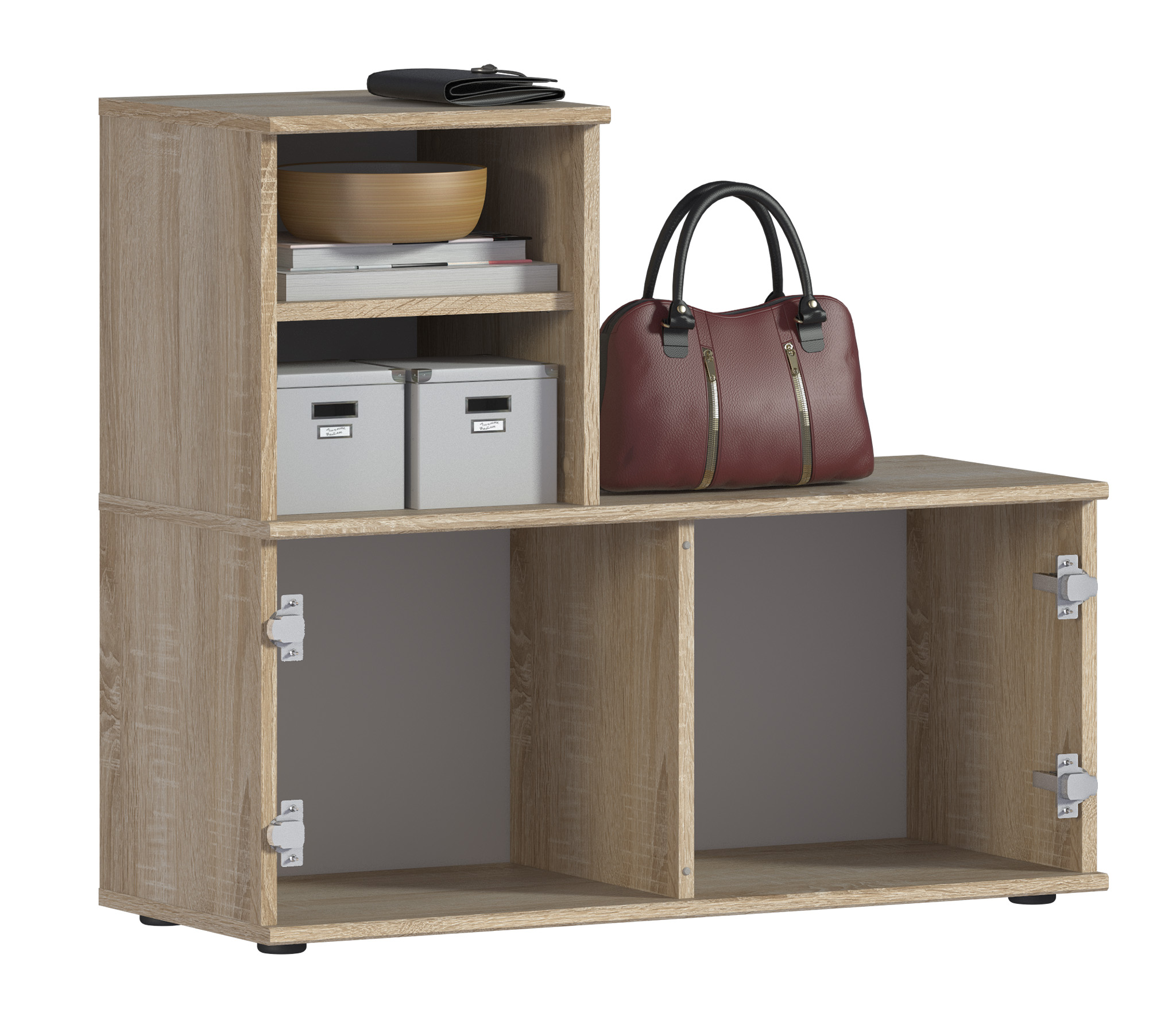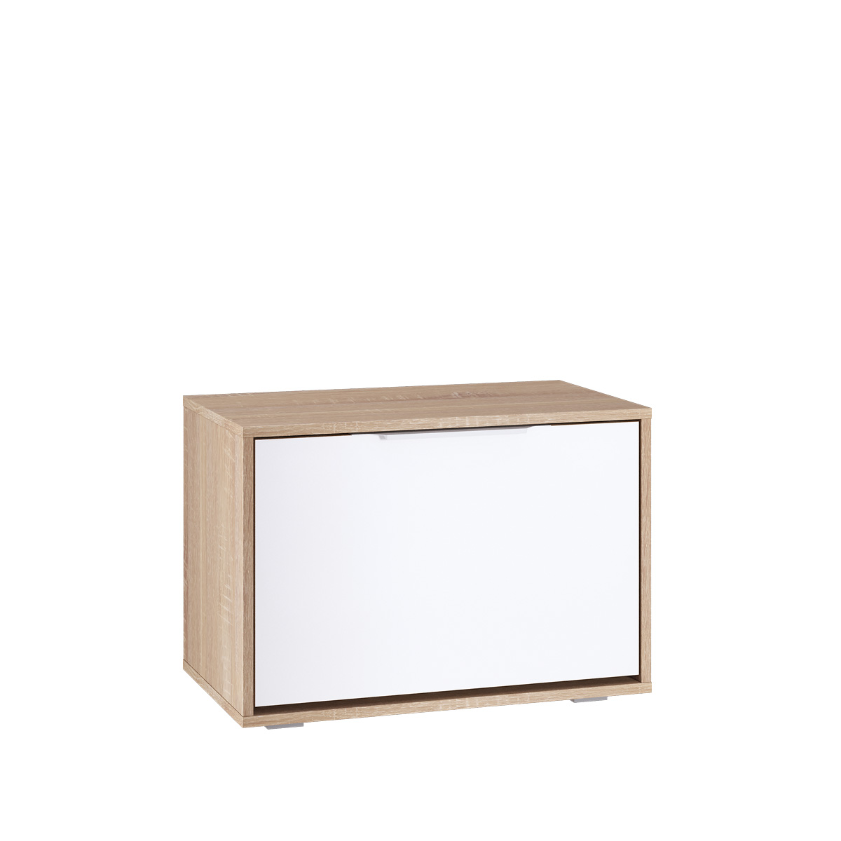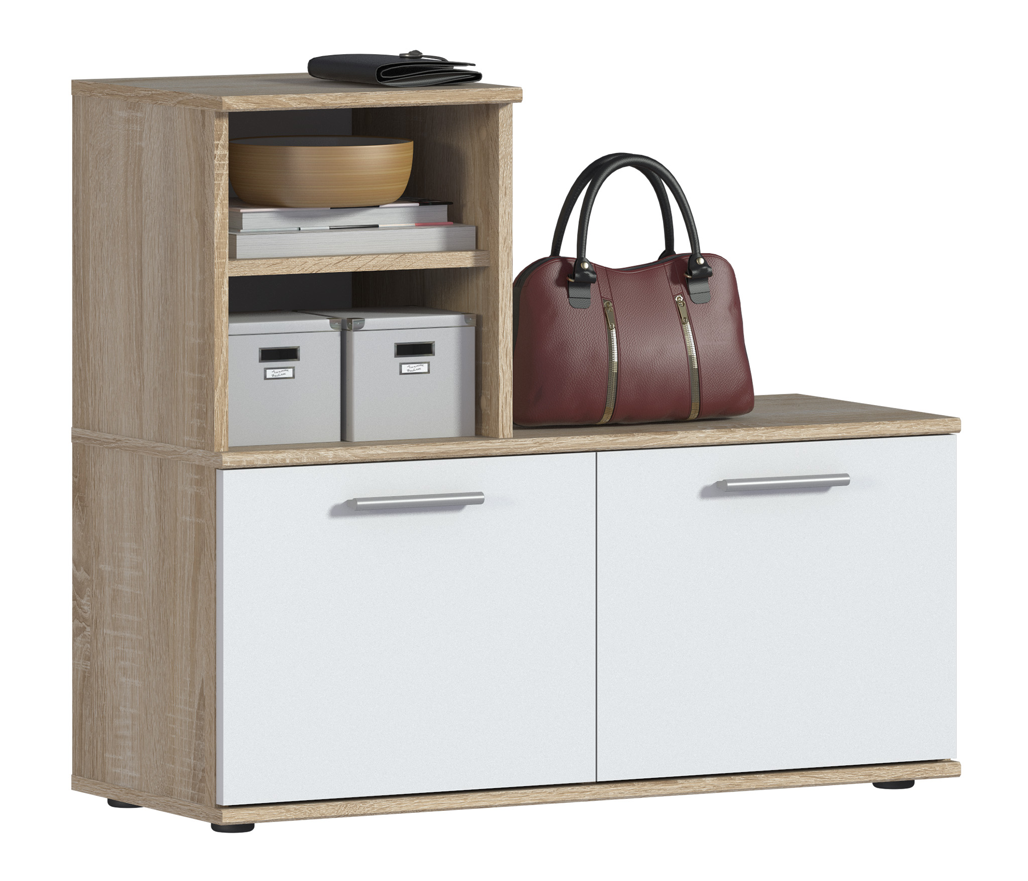 Габаритные размеры – ширина 87 см, высота 76 см и глубина 35 см. В двух вместительных отделениях тумбы помещается до восьми пар обуви. Каждое отделение имеет отдельную дверцу. На двух открытых полках можно хранить различные мелочи. Тумба произведена из экологичного прочного КДСП, устойчивого к мелким механическим повреждениям. Отделка комбинированная – корпус в цвете «Дуб Сонома», фасадные поверхности чисто белые. Тумба снабжена протекторами, которые сберегут пол от царапин.
